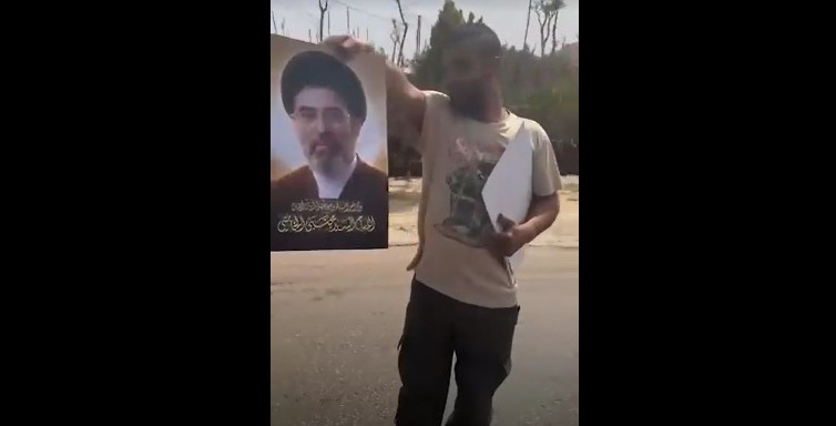 يوزّع عدد من الأشخاص صوراً للمرشد الإيراني مجتبى خامنئي، على النازحين الجنوبيين العائدين الى بلداتهم.